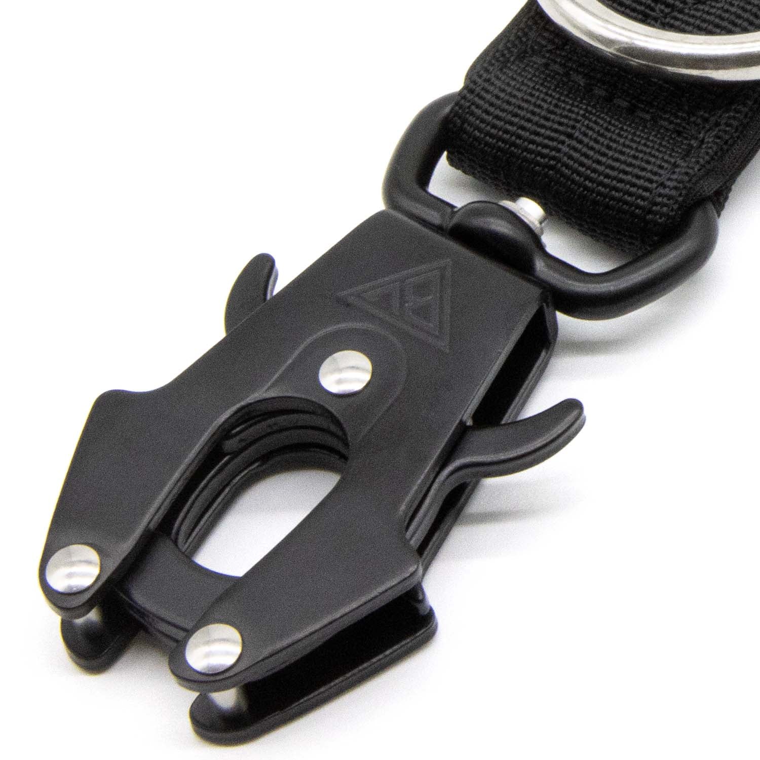 The safety lock on the short lead/short leash is doubly secured by two snap fasteners. It can only be opened by simultaneously operating both snap fasteners. The snap fastener is made of light and very stable aircraft aluminum.