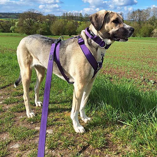 Die Leine ist super weich und schön breit kein aus der Hand rutschen mehr und auch keine roten Handflächen mehr hab sie für meine hsh Mix Dame und sie hält was sie verspricht 😉 ich hab das ganze Set und für uns nichts anderes mehr.